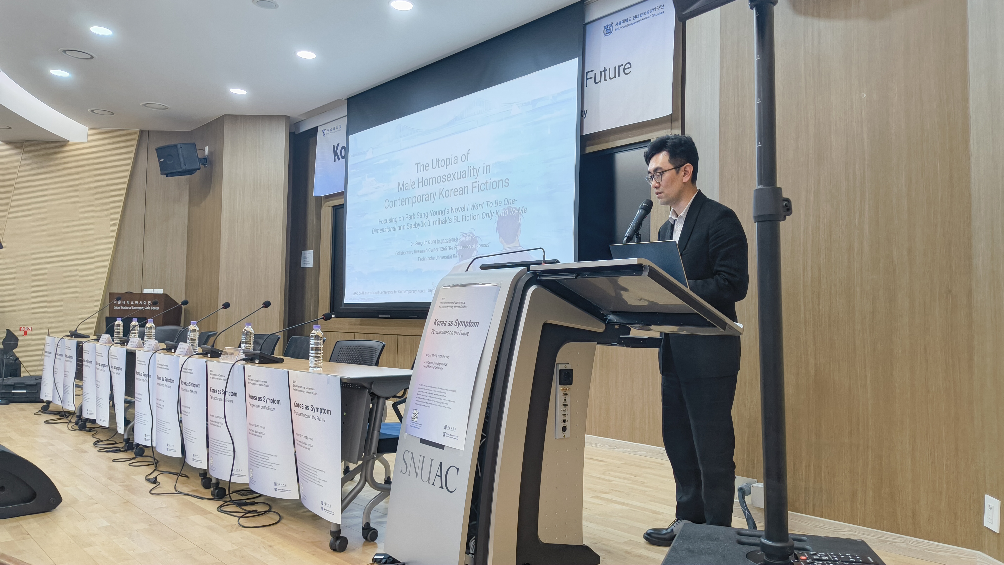 첫 번째 발표에서 베를린 공과대학교(Technische Universität Berlin)의 강성운 교수는 “The Utopia of Male Homosexuality in Contemporary Korean Fictions”를 주제로, 현대 한국의 BL(Boy’s Love) 소설에서 남성 동성애가 어떻게 이상화되는지를 다루었다. 특히, BL 장르의 소비자들이 이를 “퀴어 픽션(queer fiction)”과 구분해 부른다는 점을 지적하며, BL 장르와 실제 LGBTQ+ 경험 간의 괴리를 설명하였다. 나아가 퀴어의 고통(queer pain)과 비장소성(placelessness)을 탐구하였다.