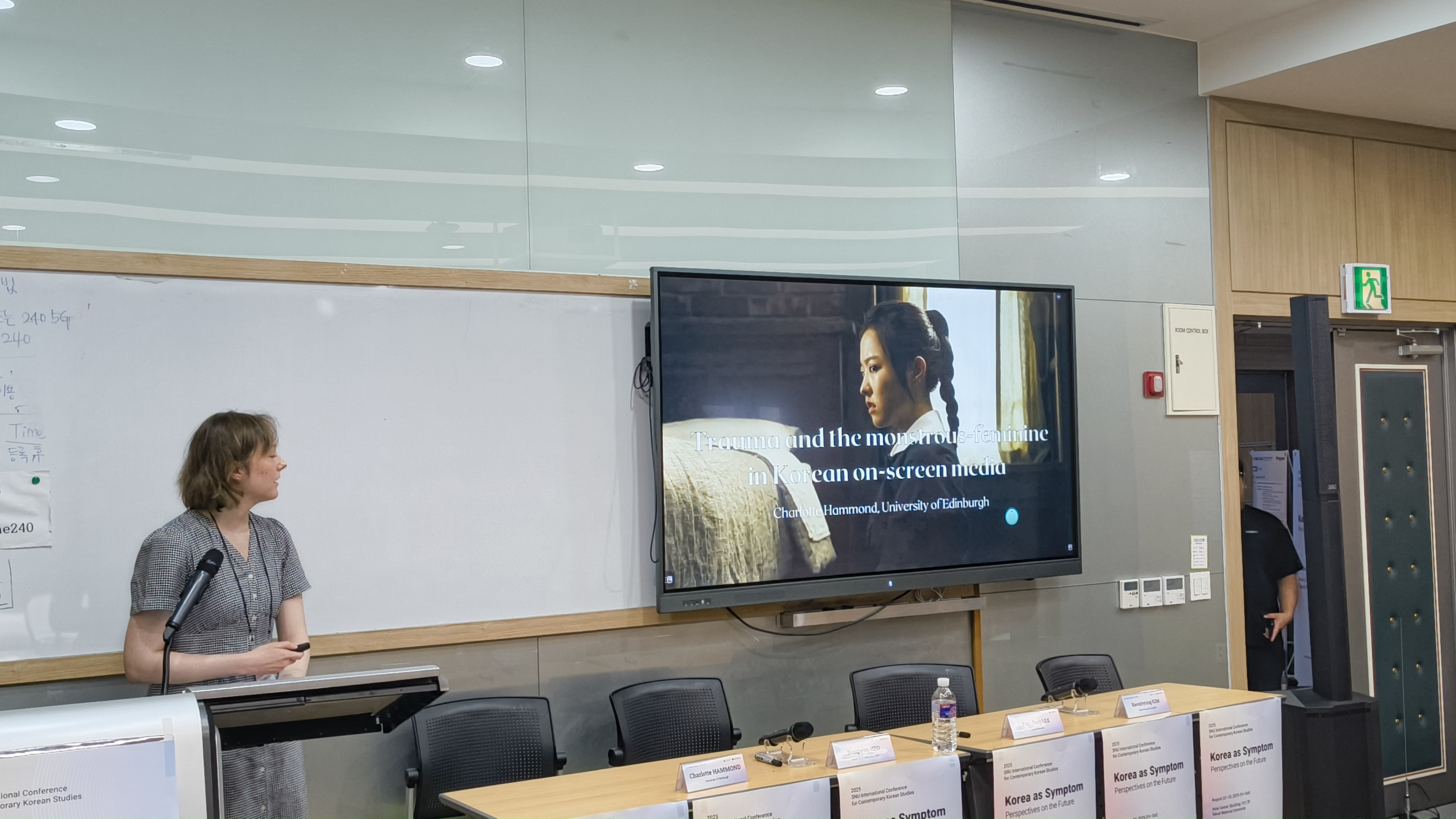 첫 번째 발표는 에든버러 대학교(The University of Edinburgh)의 샬럿 해먼드(Charlotte Hammond)의 “Trauma and the Monstrous-Feminine in Korean On-Screen Media”였다. 발표자는 한국 스크린 미디어에서 여성의 신체가 일제 식민지의 트라우마이자 성차별적 폭력의 장치로 기능한다고 분석하였다. 특히 영화 『경성 크리처』와 『경성학교: 사라진 소녀들』을 중심으로, 여성의 몸이 전쟁 동원과 공포 장르 속에서 어떻게 무기화되고 괴물화되었는지를 탐구하고, 이를 통해 여성의 몸이 식민과 현대의 트라우마를 매개하는 방식을 해석하였다.