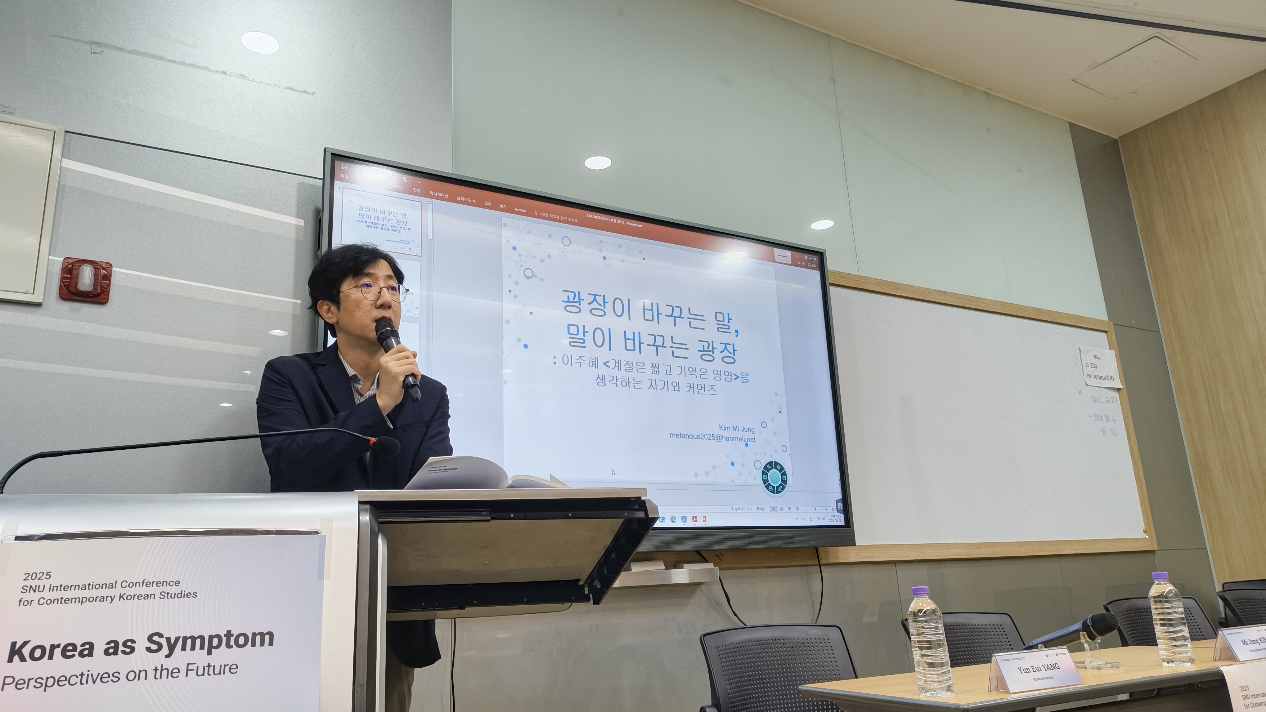 첫 번째 발표에서 성균관대학교 김미정 박사는 “The Square Changes Words; Words Change the Square”라는 주제로 한국에서 광장이 가지는 의미를 분석하였다. 발표에 따르면, 광장은 전통적으로 혁명과 변혁을 상징했지만, 최근 한국에서는 그 의미가 크게 변화하였다. 특히, 광장은 더 이상 단일한 힘이 지배하는 공간이 아니라 복잡한 욕망과 정서가 교차하는 공간이다. 발표자는 2010년대 이후 한국의 정치적 광장이 형성된 조건을 탐구하고, 문학작품을 통해 광장과 언어가 서로 영향을 주고받는 과정에 대해 분석하였다.
