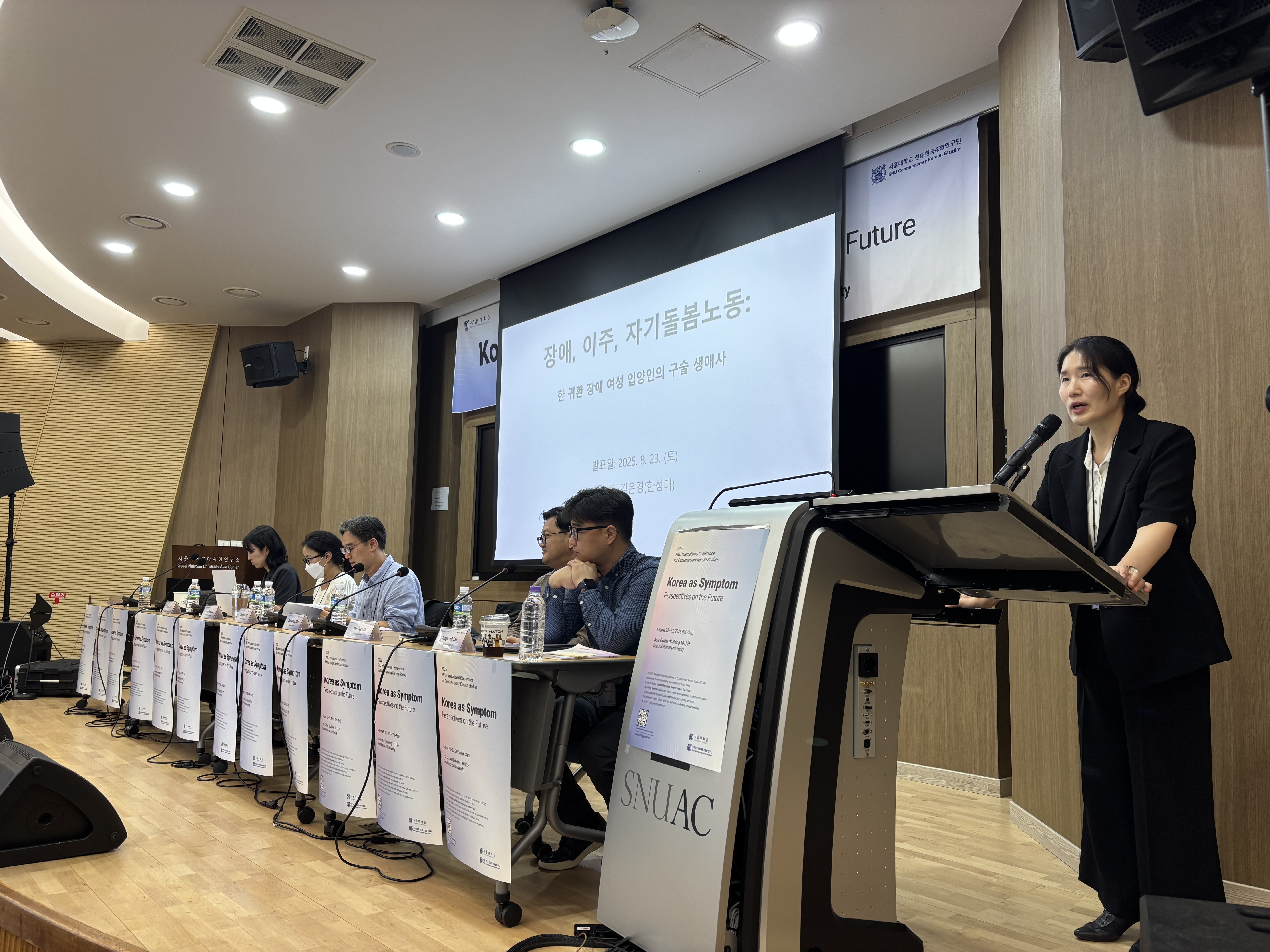 첫 번째 발표는 한성대학교 김은경 교수의 “Disability, Migration, and (Non) Labor”였다. 김 교수는 미국으로 입양되었던 한국인 장애 입양여성의 구술사를 분석하며, 장애 페미니즘의 관점에서 장애, 젠더, 그리고 이민이 교차하는 지점을 조명하였다. 특히 기존 노동 구조 속에서 비가시화되었던 생존을 위한 자기 돌봄을 “네모난 구멍에 박힌 둥근 말뚝(a round peg in the square hole)”의 역사들로 의미화하며, 한국인 장애 입양여성이 소속감과 생존을 위해 수행했던 투쟁을 가시화함으로써 그간 소외되었던 목소리를 드러내었다.