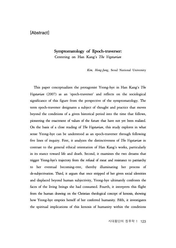 ■ Key Words: Han Kang, The Vegetarian, epoch-traversing, symptomatology, kenosis, patiency, Anthropocene