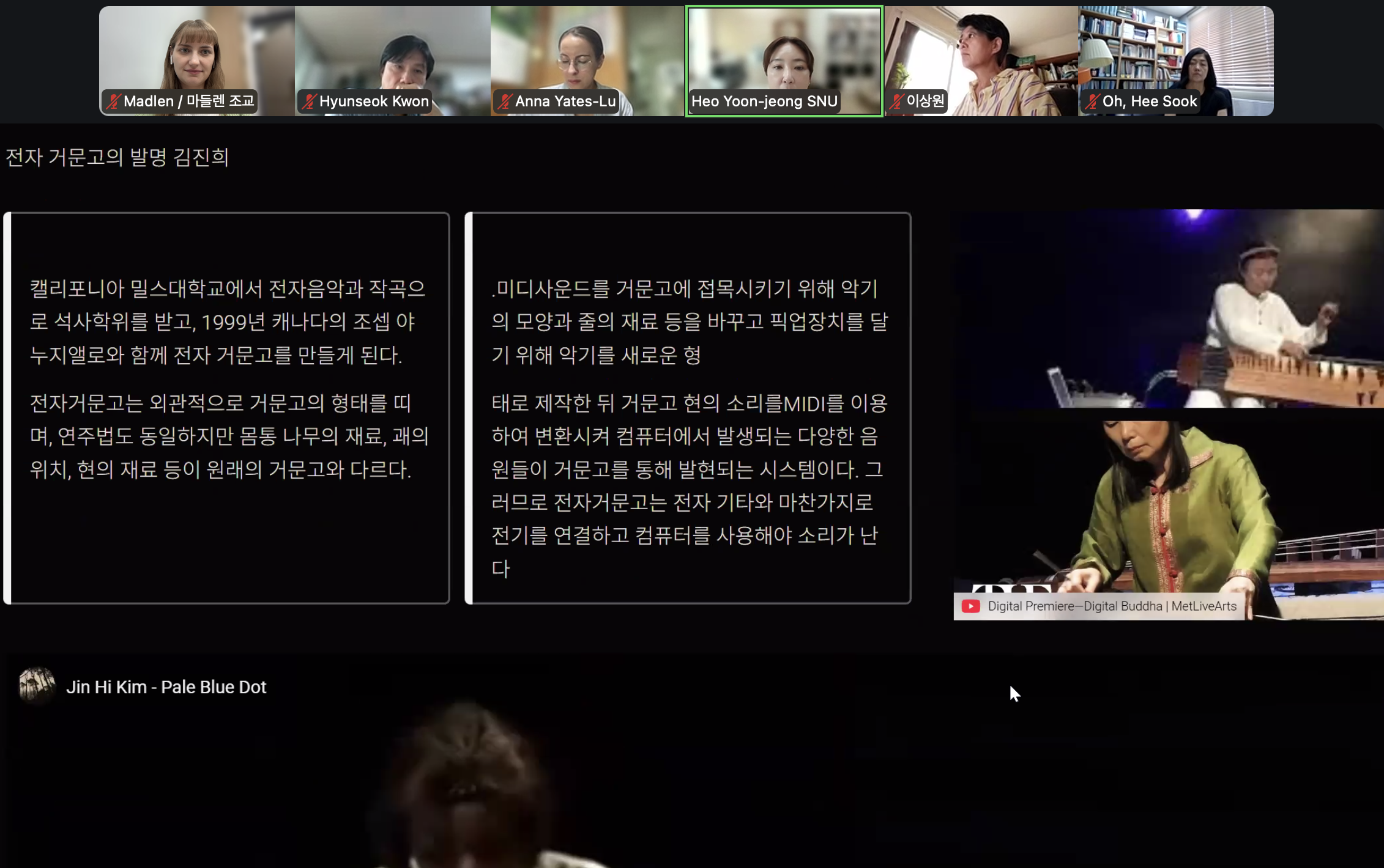 첫 번째 발표에서 서울대학교 허윤정 교수는 「세계 속의 국악 – 글로벌 시대의 거문고」라는 주제로, 거문고의 역사적 변천과 더불어 21세기 다양한 음악 양식 속에서의 연주 양상을 조명하였다. 전통적 기법에서부터 현대적·퓨전 스타일에 이르기까지의 폭넓은 사례가 영상과 함께 소개되어, 청중은 거문고의 현재적 가능성을 생생히 체감할 수 있었다.