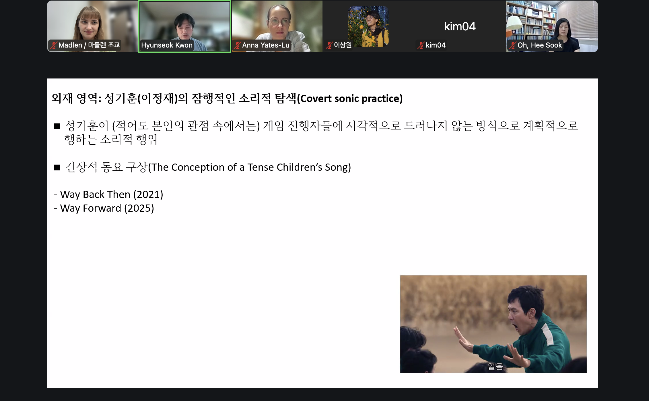 이어 한양대학교 권현석 교수는 「대중음악 연구로 한국 사회 엿보기 – 드라마 ‘오징어게임’의 사례」를 통해 대중문화 속 계급적 사운드 위계를 분석하였다. 그는 ‘오징어게임’의 내재·외재 음악을 중심으로 자본주의 한국 사회의 음향적 권력 구조를 탐구하며, 사운드가 사회적 욕망과 계급의 재현에 어떠한 역할을 하는지를 논의하였다.