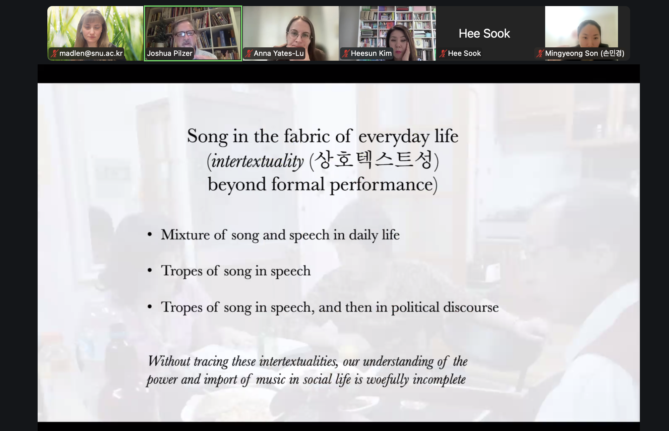 필저 교수는 한정순 선생을 만난 현장 조사 경험을 바탕으로, 노래가 형식적 공연을 넘어 일상적 말하기, 감정 표현, 나아가 사회·정치적 담론 속에까지 스며드는 과정을 탐구하였다.