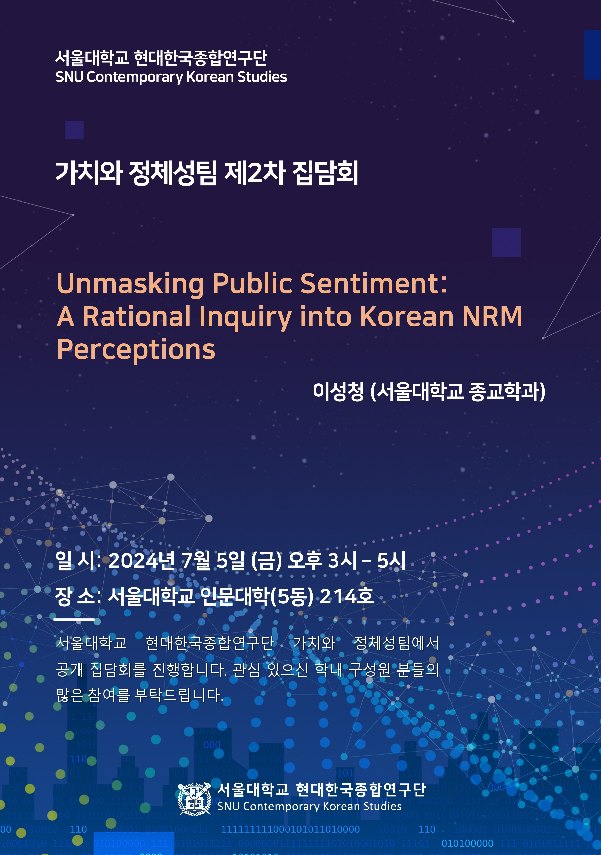 서울대학교 현대한국종합연구단 가치와 정체성팀에서 제2차 집담회를 진행합니다. 관심 있으신 학내 구성원 분들의 많은 참여를 부탁드립니다.