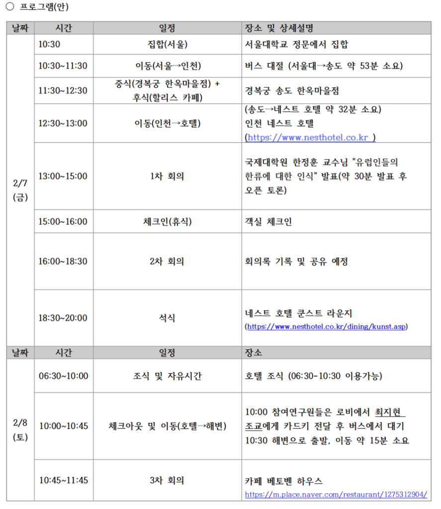 - 2⋅3차 회의(16:00~18:30, 21:00~24:00): Palgrave Macmillian 시리즈 및 국제학술대회 구성 회의