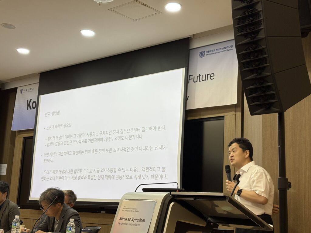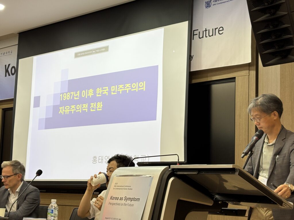 두 번째 발표에서 국방대학교 홍태영 교수는 “Liberal Transition of Korean Democracy after 1987”을 주제로, 1987년 민주화와 1997년 외환위기 사이 자유주의의 실패 원인을 분석하였다. 그는 민주화 이후 자유주의가 한국 정치의 주된 이데올로기였음에도 불구하고, 1997년 신자유주의적 전환, 노동운동 제도화의 미비, 협소한 대의제 구조, 그리고 보수적 민주화가 맞물리면서 자유주의적 자기 통치의 정착에 실패했다고 평가하였다.