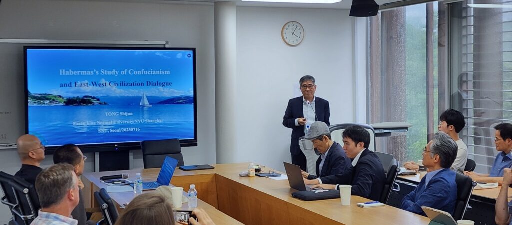 Although Confucianism is discussed in Habermas’s Also a History of Philosophy (2019) as one of the Axial traditions, its status as a world-view of “immanent transcendence” has not been sufficiently explicated. In order to do so, one needs not only to have more knowledge of different sub-schools and different generations of Confucianism, but also to have a deeply seated participant perspective.이번 콜로키움은 통쉐진(童世骏) 상하이 뉴욕대학교(NYU Shanghai) 총장의 강연을 중심으로, 하버마스의 『또 하나의 철학사』에 제시된 유교 해석을 매개로 동서 문명 대화의 가능성을 검토하는 자리로 마련되었다. 통쉐진 총장은 유교를 ‘내재적 초월(immanent transcendence)’의 세계관이자 교육과 학습을 핵심으로 하는 ‘학습된 종교(learned religion)’로 재해석하며, ‘배움에 대한 사랑’이라는 메타-덕이 동아시아 정치철학에서 갖는 의미를 강조했다. 특히 성찰적 학습 역량의 제도화, 도구적 합리성과 능력주의에 대한 비판, 그리고 학습과 권력의 관계가 주요 쟁점으로 논의되었다. 이어진 토론에서 서울대 사회학과 한상진 명예교수는 이러한 이론적 논의를 한국 사회의 최근 정치적 경험과 연결시키며, 하버마스와 유교가 추상적 차원에 머무르지 않고 민주주의의 실제 장, 즉 거리와 공론장에서 어떻게 만날 수 있는지를 제시하였다. 전반적으로 이번 행사는 유교를 동아시아 사회의 현재적 정치철학 자원으로 재검토하고, 학습과 민주주의, 공론장의 관계를 복합적으로 성찰하는 공간이 되었다.