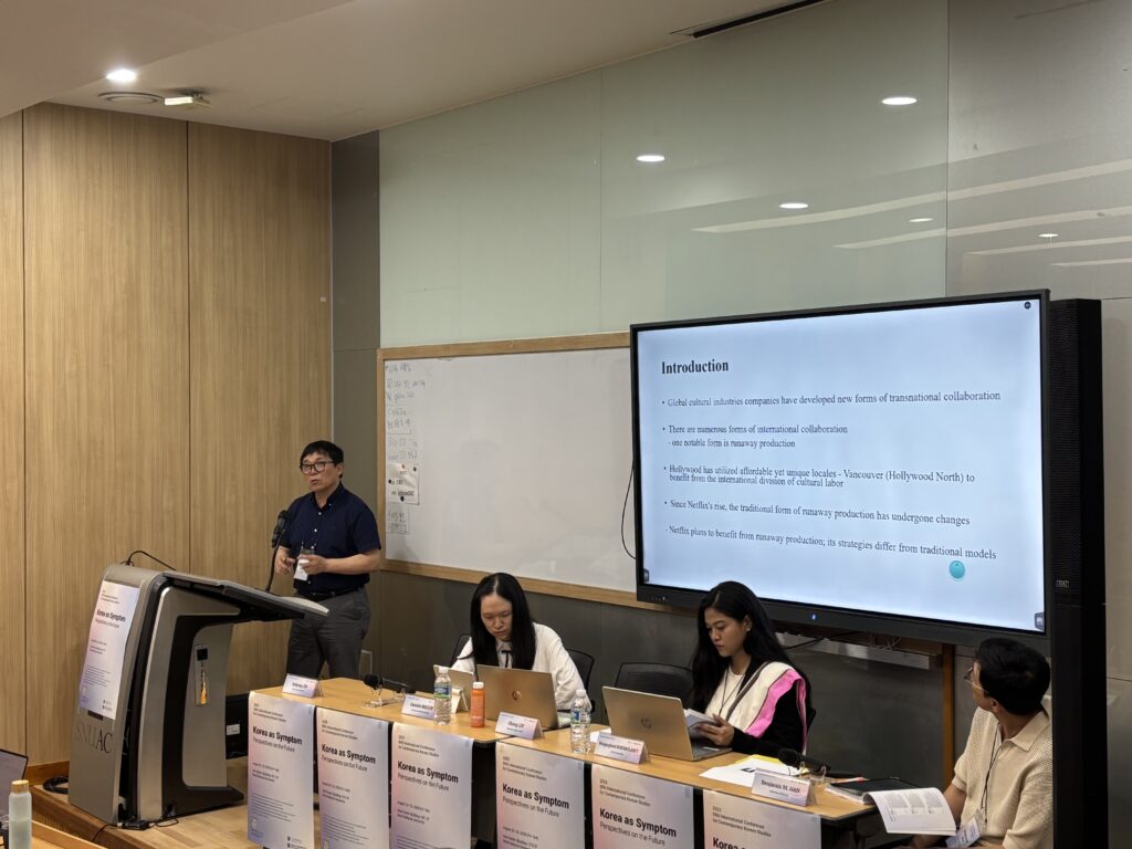 첫 번째 발표에서, 사이먼 프레이저 대학교(Simon Fraser University)의 진달용 교수는 “A Full-Package Production Model: The Development of New Runaway Production in the Netflix Era”을 주제로 넷플릭스를 통한 한국 문화산업의 국제 협력 방식의 변화를 분석하고, 이 과정에서의 넷플릭스의 역할을 강조하였다.