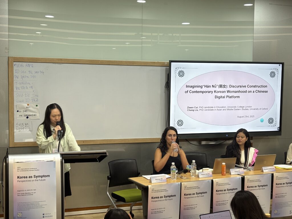 다음으로, 유니버시티 칼리지 런던(University College London)의 최즈원(Ziwen Cui)과 옥스퍼드 대학(University of Oxford)의 류창(Chang Liu) 박사과정생은 “Imagining ‘Han Nü’: Discursive Construction of Contemporary Korean Womanhood on a Chinese Digital Platform”을 주제로, 젊은 중국 여성들 사이에서 포스트페미니즘적 롤 모델로 떠오른 ‘Han Nü(한국 여성)’ 담론에 대해 분석하였다. 특히, ‘Han Nü’ 담론은 중국 사회에서 여성의 신체 관리와 직업적 기준에 대한 고정관념을 강화하며 소비주의적 요소를 통해 현대적이고 독립적이며 자기 관리가 철저한 여성상을 부각시킨다고 분석하였다.