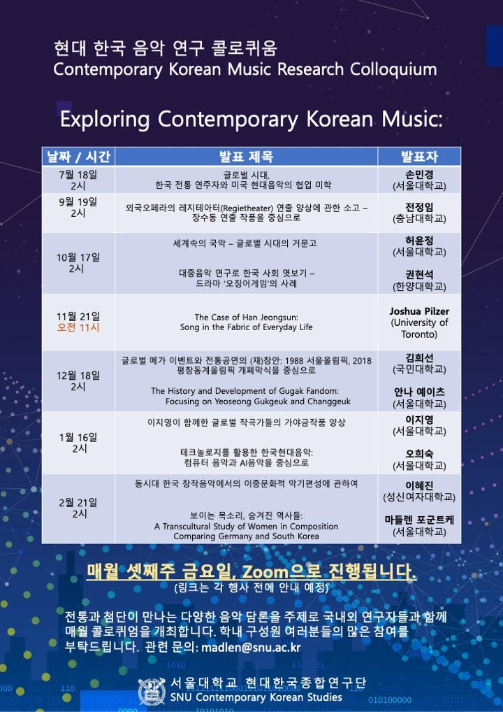 서울대학교 현대한국종합연구단 음악팀은 전통과 첨단이 만나는 다양한 음악 담론을 중심으로 국내외 연구자들과 함께 매월 콜로퀴엄을 개최합니다.