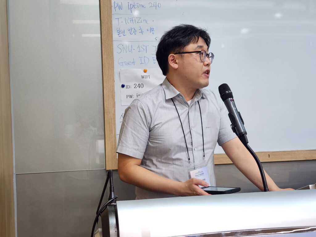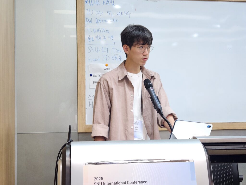 첫 번째 발표자는 서울대학교의 최인호 연구원으로, “Strange Politics in Early Modern East Asia: The Objective Value of Fictionalized History”를 주제로 발표하였다. 최인호 연구원은 허구화된 역사가 가지는 객관적 가치에 초점을 두고, 이것이 독자에게 낯선 정치(strange politics)의 체험을 가능하게 한다고 설명하였다. 헤이든 화이트(Hayden White)의 서사 이론과 마르쿠스 가브리엘(Markus Gabriel)의 존재론적 다원주의를 바탕으로, 명나라와 조선 사이의 초기 근대 정치를 분석하였으며, 이러한 허구적 서사 속에서 한국이 ‘복속’되면서도 도덕적 주체성을 가지는 역설적인 경험이 드러난다고 밝혔다.