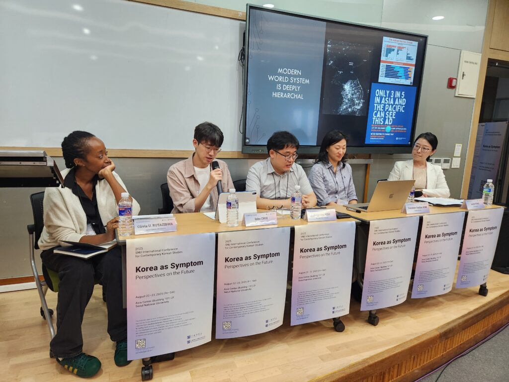 서울대학교 현대한국종합연구단은 “Korea as Symptom”을 주제로 8월 22일과 23일, 양일간 국제학술대회를 개최하였다. 국제학술대회 두 번째 세션으로 국가성과 발전사팀은 서울대학교 101동 240호에서 “Telling the Stories of Other Korea” 세션을 진행하였다. 본 세션은 런던정경대학교(London School of Economics)의 올리비아 루타지브와(Olivia Rutazibwa) 교수의 사회 아래 다음 세 개의 발표가 이어졌다.