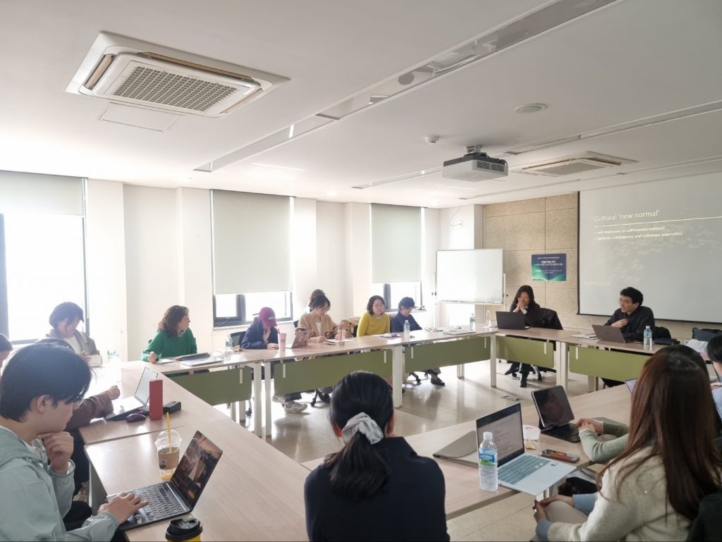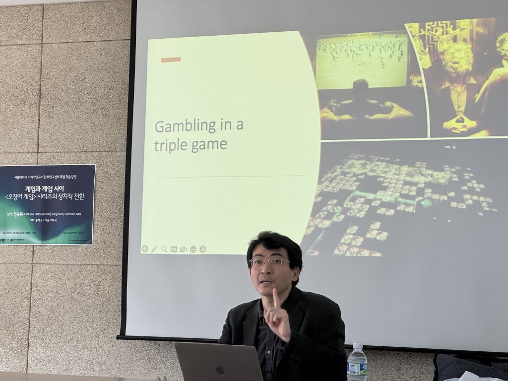 지난 4월 18일, 현대한국종합연구 글로벌 한류 팀은 캘리포니아 주립대 롱비치(California State University, Long Beach)의 Cinematic Arts 학과에서 조교수로 재직 중인 정승훈 교수를 초청해 특별 강연을 개최했다. 정승훈 교수는 글로벌 시네마, 생명정치, 그리고 한국 대중문화의 세계화에 주목해 온 연구자로, 최근에는 넷플릭스 시리즈 <오징어 게임> 을 중심으로 자본주의, 인간의 윤리, 정치성에 대한 분석을 시도하고 있다. 아시아연구소에서 열린 이번 강연의 제목은 “게임과 계엄 사이-<오징어 게임> 시리즈의 정치적 전환”으로, 드라마 속 게임 구조와 서사를 통해 오늘날 한국 사회와 글로벌 자본주의의 현실을 되짚는 시간이 마련되었다.
