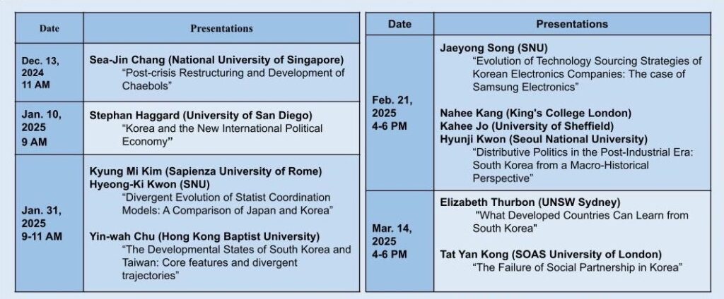 이번 세미나는 한국 정치경제를 비교사적 관점에서 조망하며 한국과 일본의 국가 조정 모델의 발전 경로와 한국 및 대만의 발전국가 특징 및 궤적을 중심으로 논의할 예정입니다. 본 세미나는 동아시아 주요 국가들의 경제 및 정치 발전이 역사적, 지정학적, 사회구조적 맥락에서 어떻게 상이하게 전개되었는지를 심도 있게 탐구할 기회를 제공할 것입니다.