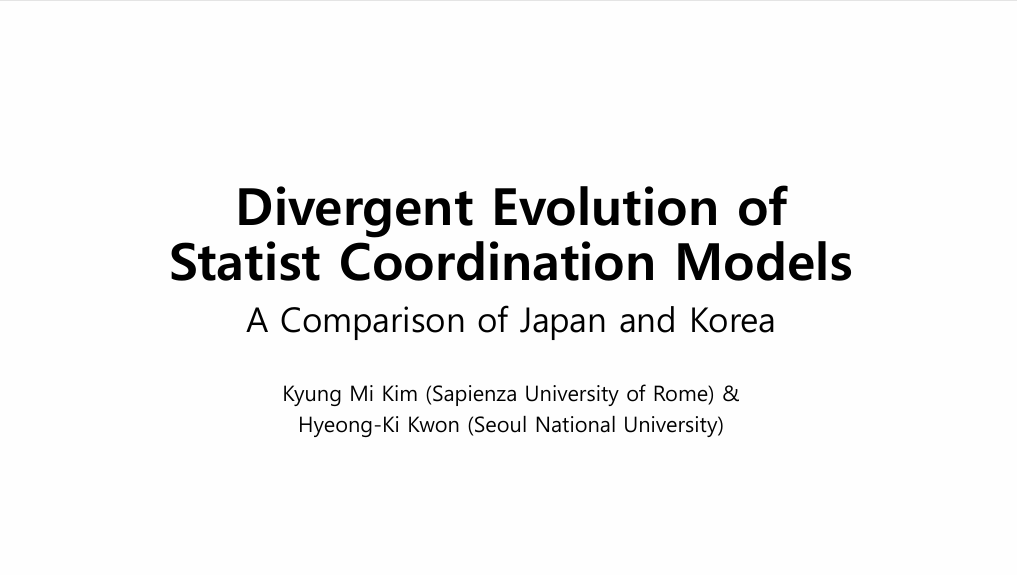 ● 발표자 1: Kyung Mi Kim ( Sapienza University of Rome ), Hyeong-Ki Kwon (SNU)주제: “Divergent Evolution of Statist Coordination Models: A Comparison of Japan and Korea”