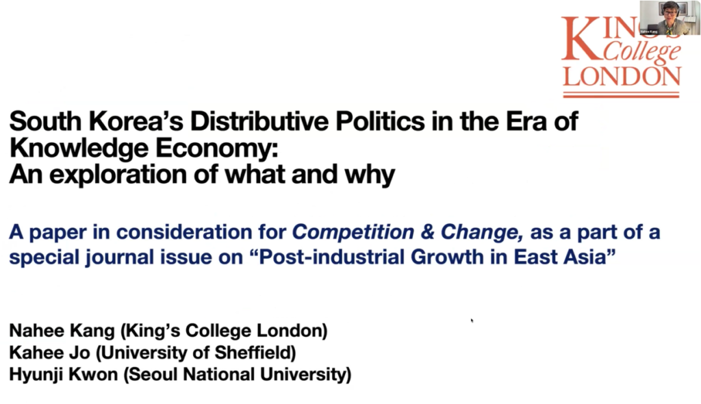 ● 발표자 2: Nahee Kang (King’s College London), Kahee Jo (University of Sheffield), Hyunji Kwon (Seoul National University)주제: “Distributive Politics in the Post-Industrial Era: South Korea from a Macro-Historical Perspective”