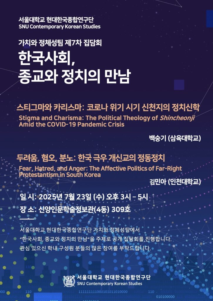 지난 7월 23일 오후 3시 서울대학교 인문대학 신양학술정보관 309호에서 현대한국종합연구 가치와 정체성팀 주관으로 “가치와 정체성팀 제7차 집담회”가 열렸다.삼육대학교 백숭기 교수는 “스티그마와 카리스마: 코로나 위기 시기 신천지의 정치신학”이라는 제목으로 발표했다. 백숭기 교수는 신천지가 코로나 위기를 거치며, 도리어 자기 정당화와 내부의 결속을 강화할 수 있었다고 설명했다.인천대학교 인문학연구소 김민아 박사가 “두려움, 혐오, 분노: 한국 극우 개신교의 정동정치”라는 제목으로 발표했다. 김민아 박사는 극우 개신교의 정치적 목소리를 이해하기 위해서 당사자들의 감정과 정동을 복합적으로 이해해야 한다고 주장했다.