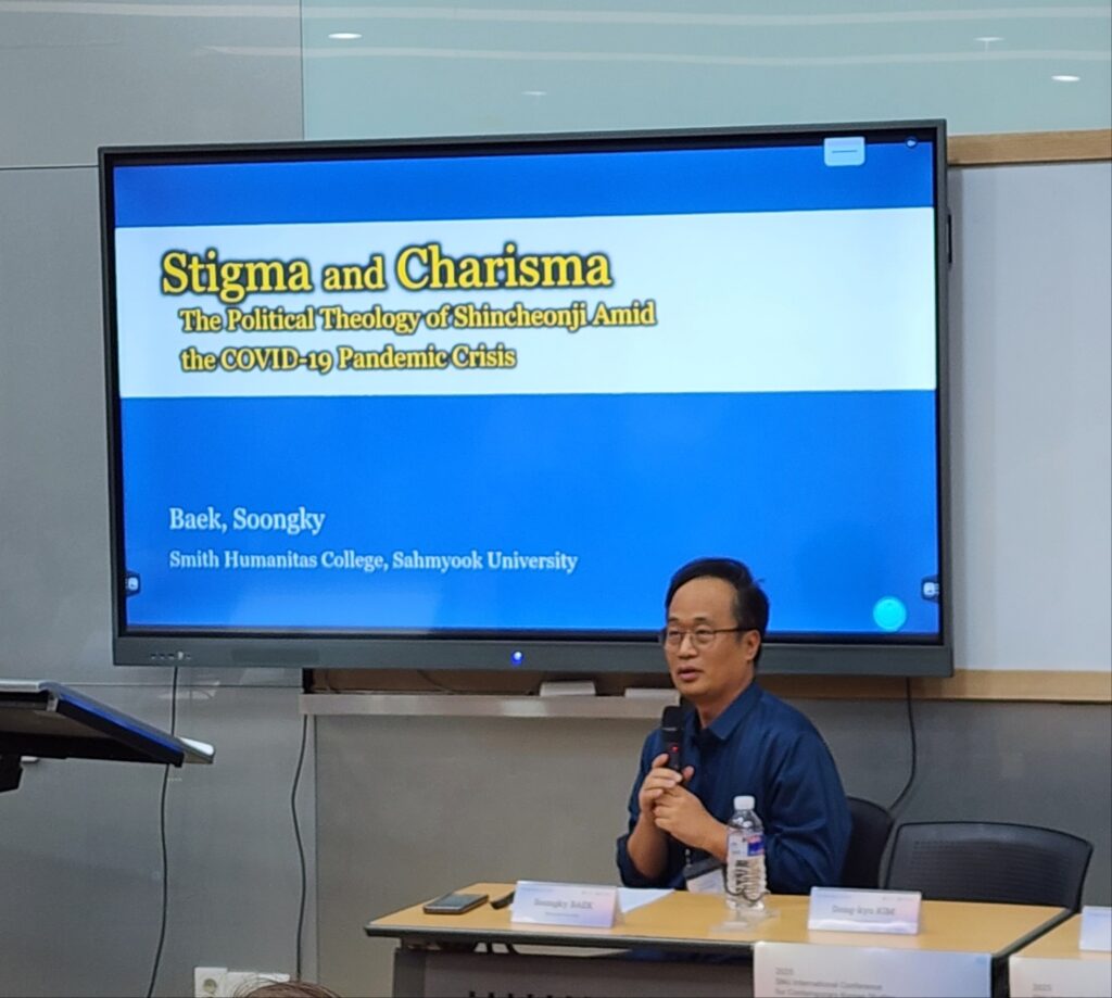 두 번째 발표는 삼육대학교의 백숭기 교수의 “Stigma and Charisma: The Political Theology of Shincheonji Amid the COVID-19 Pandemic Crisis”였다. 백숭기 교수는 팬데믹 시기 신천지가 ‘사회적 바이러스’로 낙인찍히며 강력한 공적 비난의 대상이 되었음을 설명하였다. 이어 신천지가 이러한 낙인에 대응하기 위해 자신들을 비합리적인 박해의 희생자로 서술하고, 신도의 증가를 종말론적으로 재해석했으며, 동시에 방역 당국과의 협력과 같은 순응적 전략을 통해 사회적 정당성을 확보하고자 했음을 분석하였다. 이는 신흥 종교가 적대적 환경 속에서 정당성과 결속을 유지하기 위해 동원하는 전략을 잘 보여주는 사례로 제시되었다.