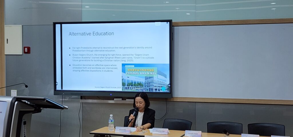 마지막 발표는 인천대학교의 김민아 박사의 “Fear, Hatred, and Anger: The Affective Politics of Far-Right Protestantism in South Korea”였다. 김민아 박사는 한국 내 극우 개신교가 중요한 정치적 행위자로 부상하였음을 밝히며, 윤석열 대통령의 계엄령과 탄핵 사태를 배경으로 이들의 정치 세력화 과정을 분석하였다. 특히 극우 개신교가 두려움, 증오, 분노를 동원하여 내부 결속을 강화하는 동시에, 외부적으로는 민주적 가치와 제도적 정당성을 약화시켰음을 지적하였다.